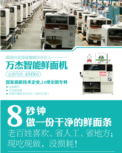 2017年6月23日-25日,萬杰智能將攜手惠每家參加在山東濰坊舉辦的“2017亞洲調(diào)理食材大會暨創(chuàng)新產(chǎn)品展”。緊接著,2017年6月26日-28日,在江蘇張家港參加 “中醬杯”全國餐飲酒店業(yè)首腦CEO峰會。屆時,歡迎有意向的城市合伙人以及餐飲終端伙伴們蒞臨萬杰展位進行參觀洽談。 萬杰智能鮮面機“現(xiàn)吃現(xiàn)做,8秒出面”,擁有22項專利,全國首創(chuàng),已在北京、河北、河南、內(nèi)蒙、吉林、甘肅等地面世,得到了消費者的一致認可與好評。本次展會,智能鮮面機將再一次與全國意向合作伙伴們“見面”。如果您是餐飲界“大咖”,擁有豐富的餐飲資源,智能鮮面機持續(xù)的盈利空間以及萬億級的市場前景,可能是您愿意嘗試的好項目。如果您是快餐店、面館、火鍋店等餐飲終端的老板,智能鮮面機不僅可以幫您節(jié)省人工,獲得更多利潤,同時全透明的制面過程,還可以吸引更多客流。 8秒做一份干凈的鮮面條,讓制作過程在百姓的“眼皮”下進行,這一保障主食安全的創(chuàng)新之舉,這份關(guān)乎億萬家庭主食安全的事業(yè),需要更多有識之士共同參與才可發(fā)展壯大!本次濰坊,張家港兩個展會,不僅將產(chǎn)業(yè)、商業(yè)、學界大咖共聚一堂,還聚集了來自全國的餐飲精英,萬杰智能期待有著共同事業(yè)理想的伙伴們前來咨詢,我們等著你,不見不散! 展會信息: 1、 2017亞洲調(diào)理食材大會暨創(chuàng)新產(chǎn)品展 時間:6月23-25日 地點:山東濰坊福環(huán)國際展覽中心 2、“中醬杯”全國餐飲酒店業(yè)首腦CEO峰會 時間:6月26-28日 地點:蘇州張家港國貿(mào)酒店 |