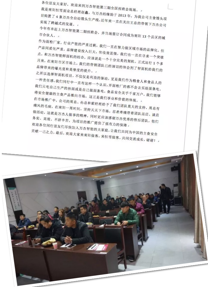 | 2017年12月29日,萬杰智能鮮面機(jī)第三期全國招商會(huì)和中型生產(chǎn)線新品發(fā)布會(huì)同時(shí)在萬杰智能總部召開。在新的一年即將到來之際,眾多經(jīng)銷商和糧油界的朋友們寄托新的希望,齊聚萬杰展望未來,共謀未來發(fā)展新商機(jī)。 為了讓嘉賓們能夠更加深入的了解萬杰智能,主辦方特地安排嘉賓在招商會(huì)當(dāng)天上午參觀萬杰智能工廠,從生產(chǎn)制造中心、研發(fā)中心、產(chǎn)品展示廳到遠(yuǎn)程控制中心,使嘉賓們充分了解萬杰智能的研發(fā)能力和制造實(shí)力,深切感受到萬杰智能20年的積累。 經(jīng)過午餐和簡單的茶歇,嘉賓們齊聚萬杰招商會(huì)現(xiàn)場,萬杰智能第三期全國招商大會(huì)正式開始。會(huì)上,首先由北京先行曾鵬飛為意向合伙人做萬杰智能鮮面機(jī)的項(xiàng)目介紹;然后由萬杰智能科技股份有限公司王曉杰董事長做“傳統(tǒng)還在,未來已來”主題報(bào)告;最后由來自南陽和新鄉(xiāng)的城市合伙人為意向合伙人分享市場心得和運(yùn)營經(jīng)驗(yàn),涵蓋了從終端洽談、現(xiàn)場陳列、消費(fèi)者溝通等眾多細(xì)節(jié),內(nèi)容豐富全面,引來現(xiàn)場不少嘉賓的共鳴。 由于萬杰智能鮮面機(jī)擁有出色的產(chǎn)品力和科學(xué)的商業(yè)模式,現(xiàn)場不少嘉賓都對萬杰智能鮮面機(jī)項(xiàng)目產(chǎn)生了濃厚的興趣。目前,萬杰智能的相關(guān)工作人員正在和有合作意向的嘉賓就合作細(xì)節(jié),進(jìn)行深度的商談接洽。 本次招商會(huì)的順利召開,為中國的傳統(tǒng)制造行業(yè)注入了一股新的活力。未來,萬杰智能將繼續(xù)堅(jiān)持科技智能創(chuàng)新,為中國的老百姓創(chuàng)造更多更好的智能主食機(jī)械,為中國億萬家庭的主食安全保駕護(hù)航。 招商會(huì)花絮 |